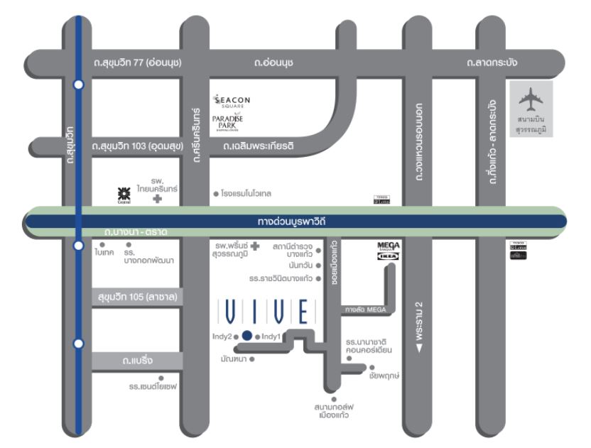 สถานที่สำคัญใกล้บ้าน: Mega Bangna – 1.5 กม. สนามกอล์ฟเมืองแก้ว – 2 กม. รร.นานาชาติ Concordian – 1.5 กม. Central Bangna – 9.2 กม. สนามบินสุวรรณภูมิ – 20 กม.